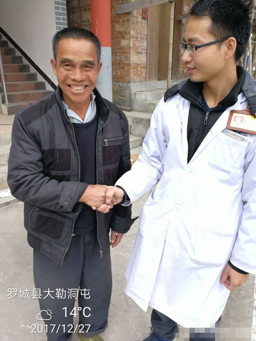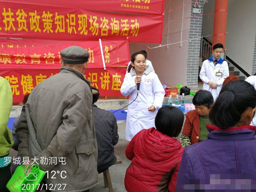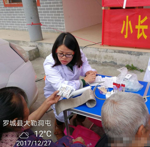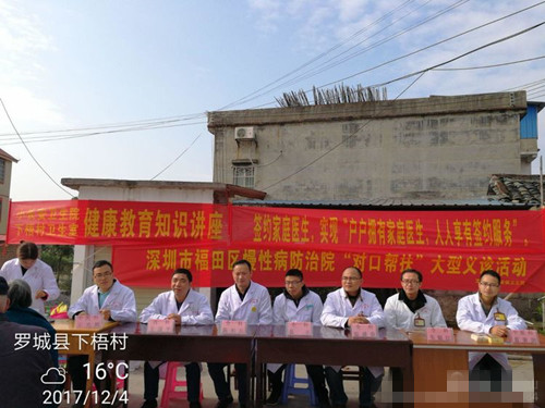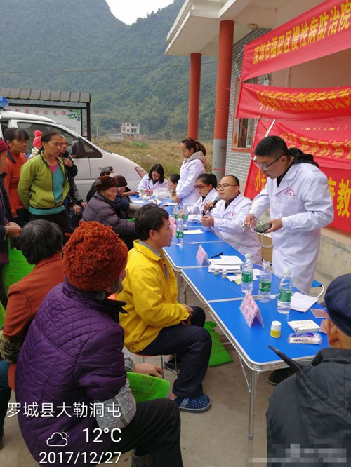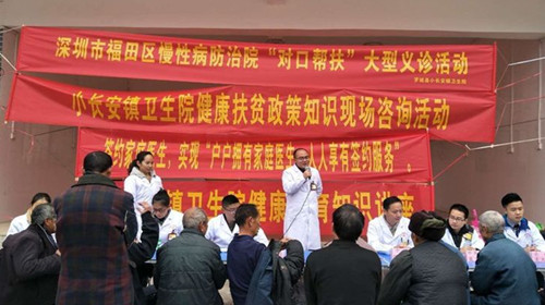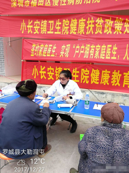 小长安镇卫生院温院长热情洋溢地介绍了健康扶贫的一些政策。福田区慢性病防治院陈柏兵主任向乡亲们表态,愿用全部专业技术倾情服务,闻讯赶来的乡亲们脸上带着笑容,排队就诊。一位高血压合并糖尿病的村民血压一直在180/110mmHg以上,医生经过仔细研究,及时调整用药方案。