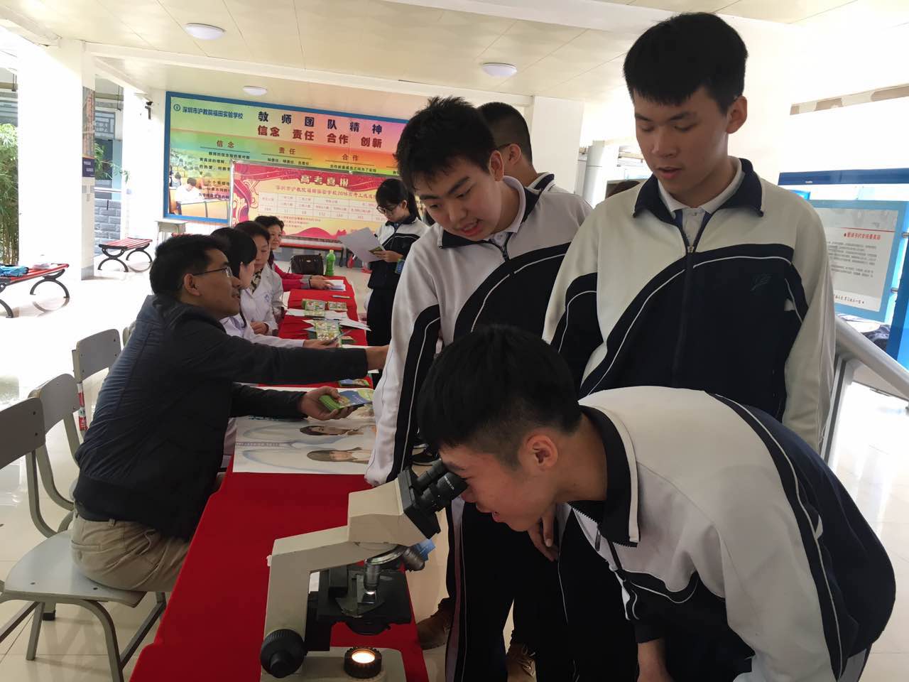 3月22日下午,福田区慢性病防治院结核病防治科的医生来到(沪教院)福田实验学校,为该校师生做有关结核病的现场咨询、科普讲座和问卷调查。一些学生饶有兴趣地通过显微镜观察结核杆菌,并通过图文结合的宣传册以及学校结核病防治知识讲座了解了结核病防治的相关知识。