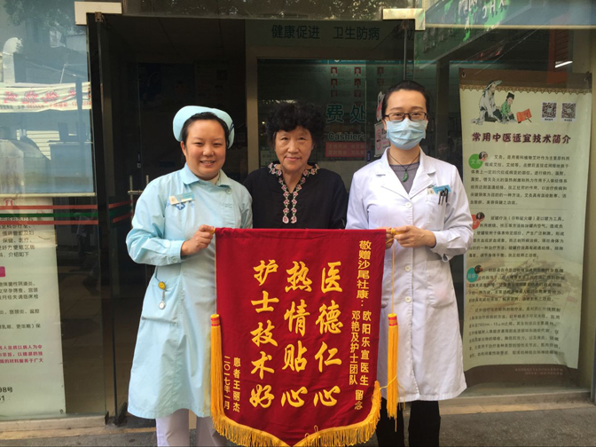 2017年伊始,沙尾社区王女士来到区慢病院沙尾社康中心,把“医德仁心,热情贴心,护士技术好”锦旗送到家庭医生欧阳乐宣医生团队手中。王女士是一位有多年慢病病史的社区老人,2016年和沙尾社康中心签订家庭医生服务合同后,家庭医生团队系统分析其病情,针对性的对老人开展社康面诊、电话随访以及微信咨询、老年体检等服务。在沙尾家庭医生团队的服务下,王女士的血压血糖得到有效控制。老人感受到社康服务的细心、耐心、责任心,特送来锦旗以表感谢。近几年,区慢病院以家庭医生服务为载体,不断探索完善慢性病综合管控及康复服务模式,为社区居民提供专业、贴心的服务,屡获居民赞誉。(文/图 欧阳乐宣)