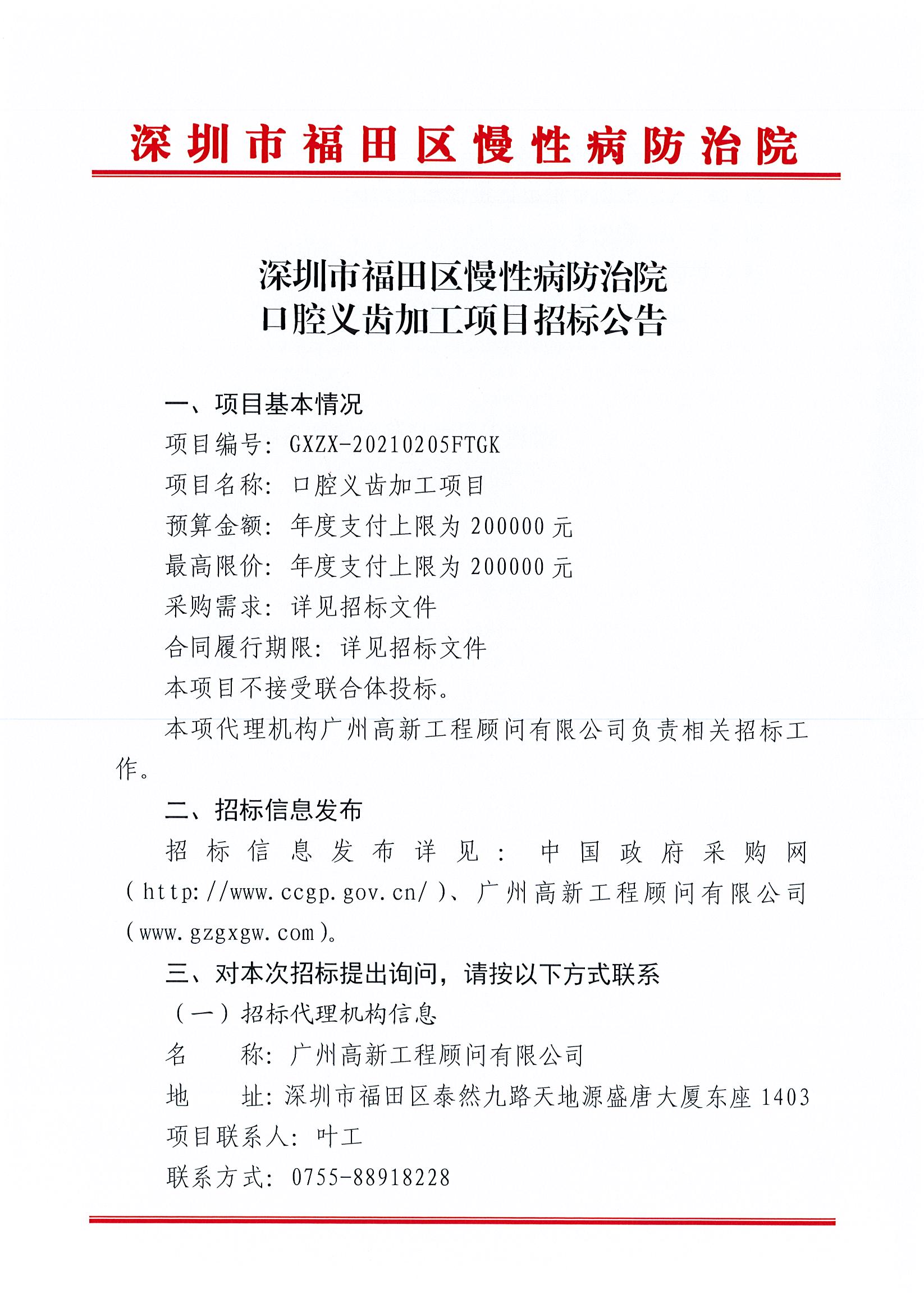 深圳市福田区慢性病防治院口腔义齿加工项目采购公告