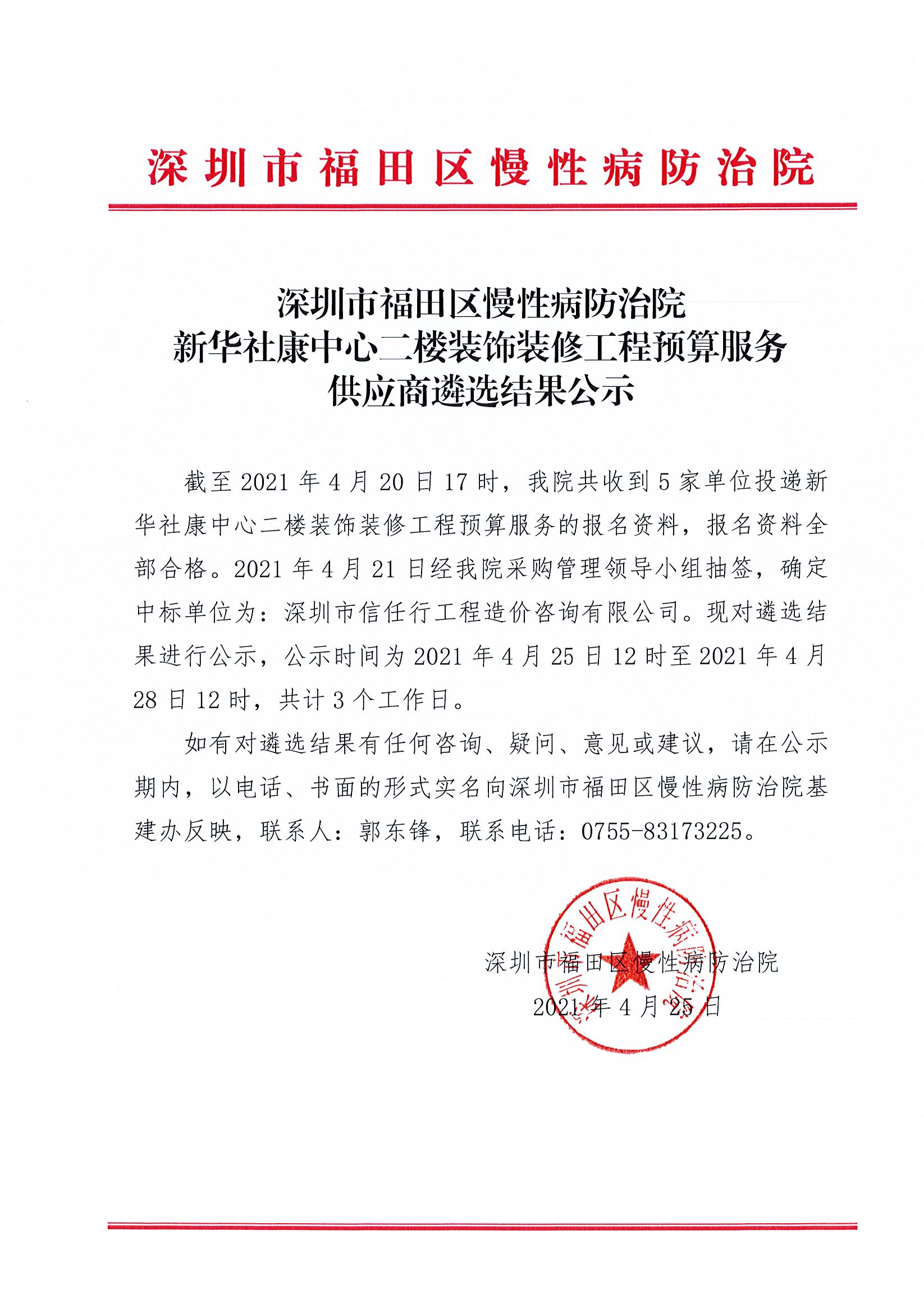 深圳市福田区慢性病防治院新华社康中心二楼装饰装修工程预算服务供应商遴选结果公示