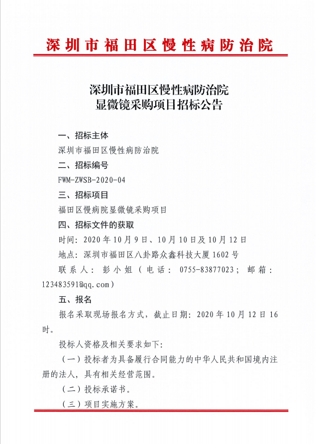 深圳市福田区慢性病防治院显微镜采购项目招标公告