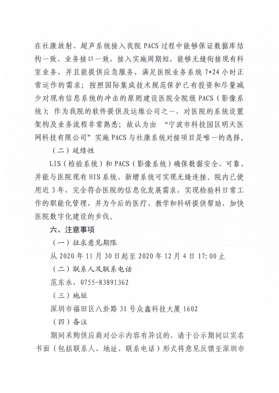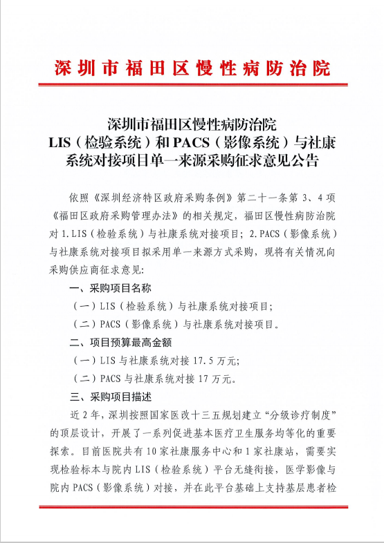 福田区慢性病防治院检验系统和影像系统与社康系统对接项目单一来源采购征求意见公告