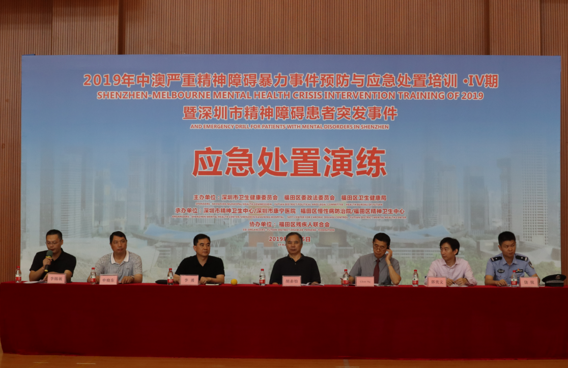 福田区委政法委、区卫健局、区公安分局、区残联领导和相关工作负责人、市精神卫生中心领导和专家、2019年中澳严重精神障碍暴力事件预防与应急处置培训班专家和学员、区慢病院相关工作人员、社区民警观摩演练。演练内容是当社区内精神障碍患者或疑似精神障碍患者出现伤人、毁物等暴力行为时,社区关爱帮扶小组成员及时发现上报,辖区精神卫生防治机构工作人员迅速响应、及时调度、果断指令、应急处置,与社康中心精防医生、民警、社区工作人员分工协作,紧密配合,对患者实施安抚、检查、病情评估、保护性约束等措施,最后将患者安全转送市康宁医院治疗。通过这次演练,检验了福田区应对精神卫生突发事件的应急处理能力和各部门之间的协调联动能力,起到了锻炼队伍、强化认识的作用。