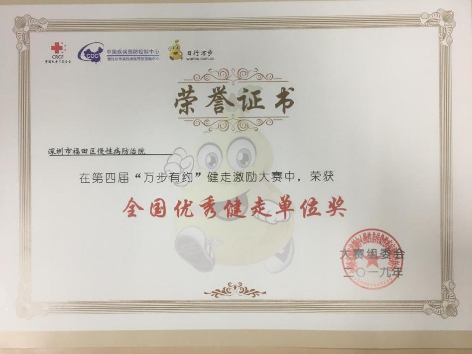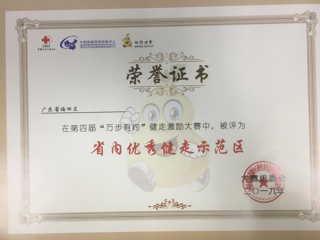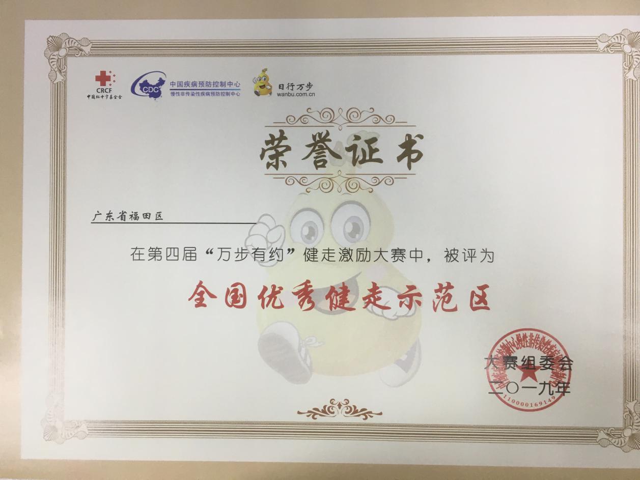 11月2日上午,全国第四届“万步有约”健走激励大赛总结表彰会在济南市莱芜区举行。本次大赛共有全国31个省571个县(区)30余万人参赛,福田区各参赛单位和队员们团结协作,坚持日行万步,按期完成了100天的健走任务,并取得优异的成绩,从全国571个县(区)中脱颖而出,荣获国家“全国优秀健走示范区”、“省内优秀健走示范区”等殊荣,其中,参赛单位福田区慢性病防治院和福田街道办事处荣获“全国优秀健走单位奖”。