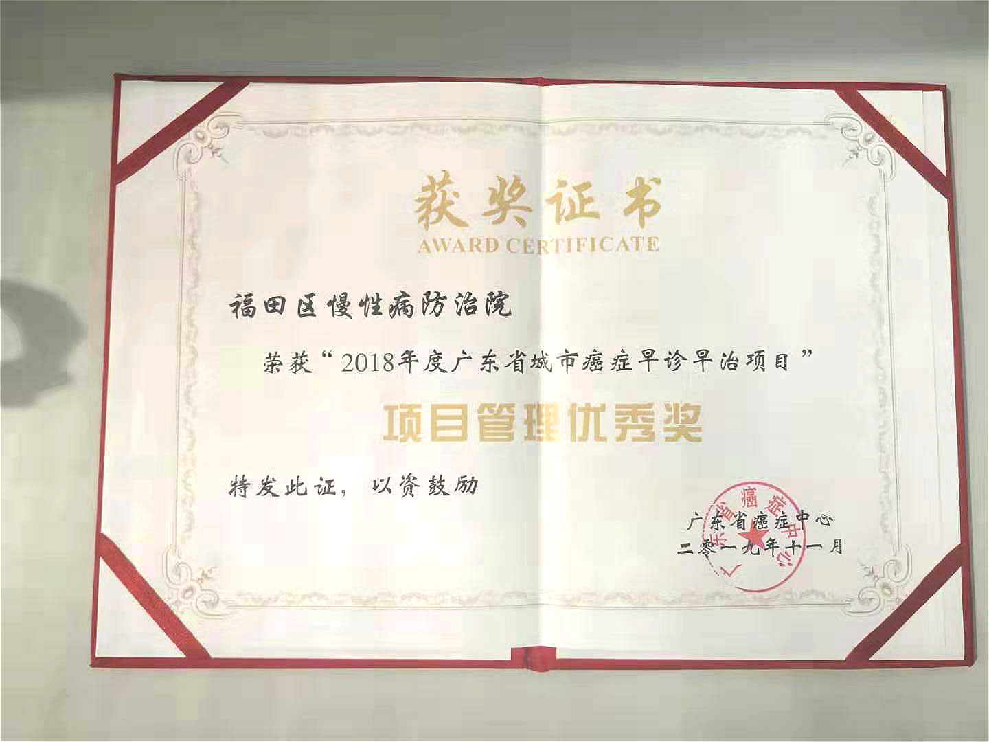 2019年11月6日,在广东省癌症中心举办的“2019年广东省城市癌症早诊早治项目启动会”上,项目实施单位福田区慢性病防治院荣获2018年度广东省城市癌症早诊早治项目“项目管理优秀奖”,为深圳市唯一区级获奖单位。