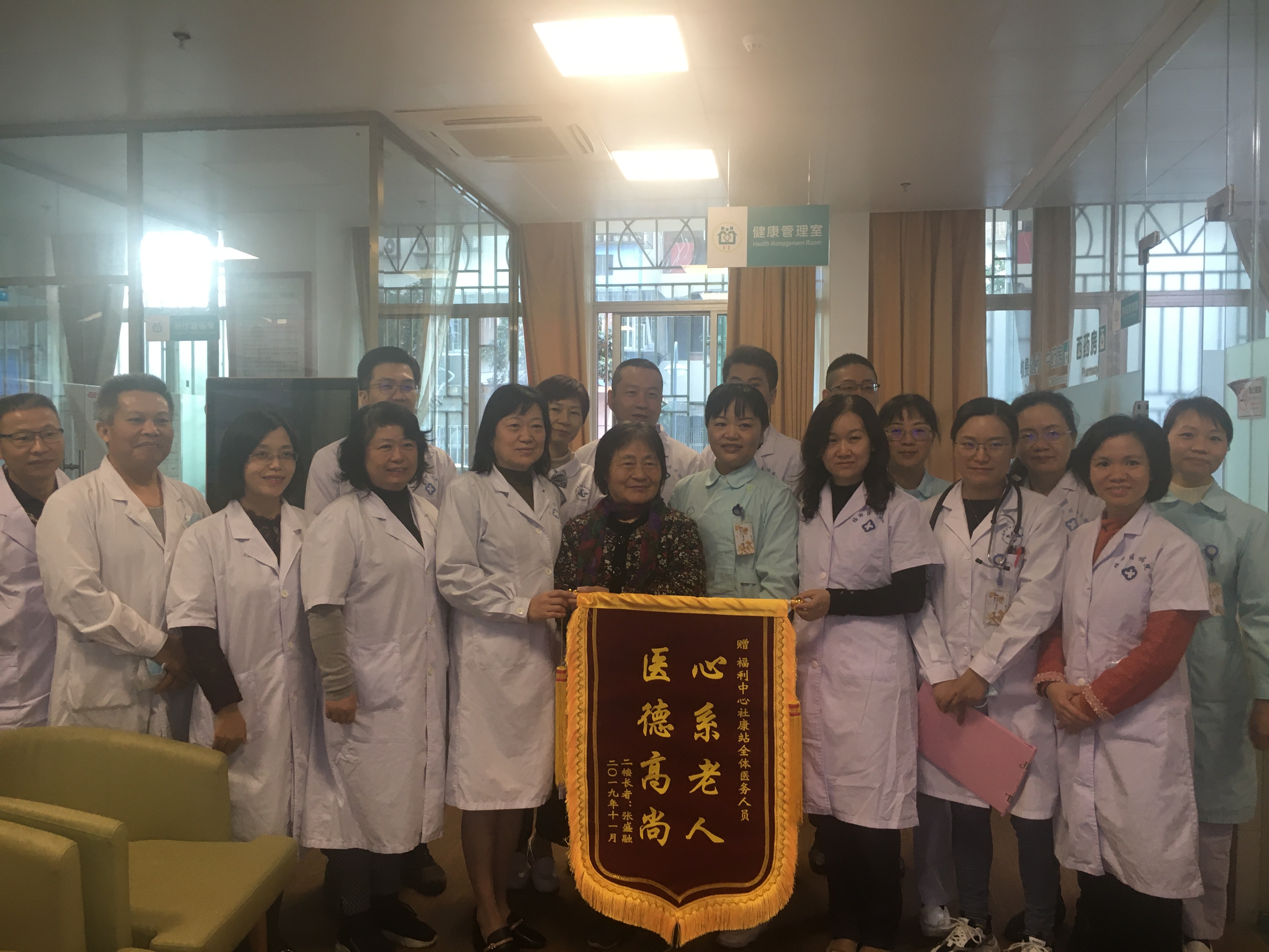 “爷爷因为长期卧床经常发生肺部感染,住院治疗让我们疲惫不堪,来到福利中心,有社康站的医生和护士为我们尽心治疗和护理,解决我们一大难题,这里的医生护士都和家人一样,在这里比在家里安心多了。”12月3日,老人的老伴给社康站送来锦旗,感谢医护人员对老人的精心护理。