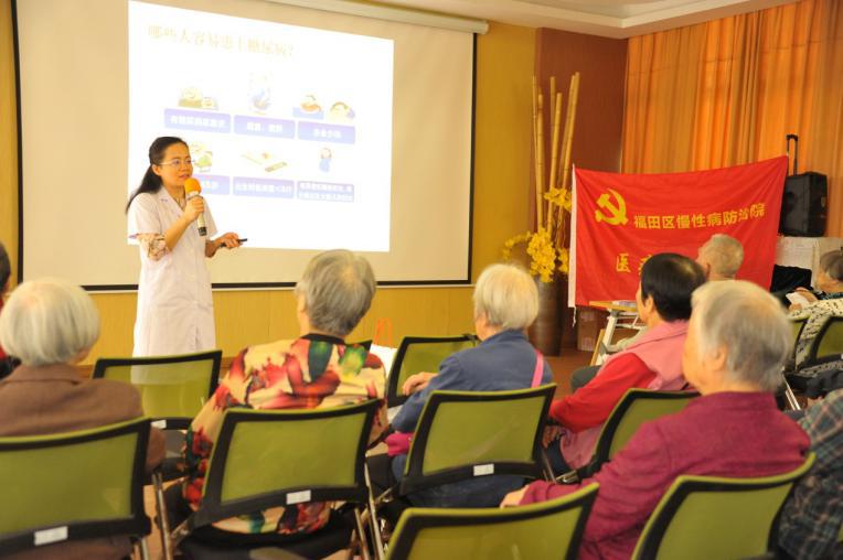 一直以来,福田区慢性病防治院积极探索具有慢病防治特色的社康卫生健康服务模式,先行先试,积累经验。社康站作为一块医养结合的试验田,精耕细作、做好防治是医院的努力方向。除了日常的精细化医疗服务,医院还组织本院及外院专家来到福利中心社康站,为银发族开展健康讲座,传播健康生活方式。