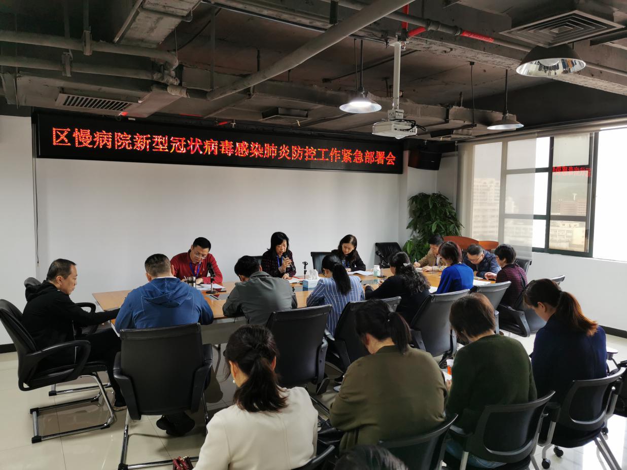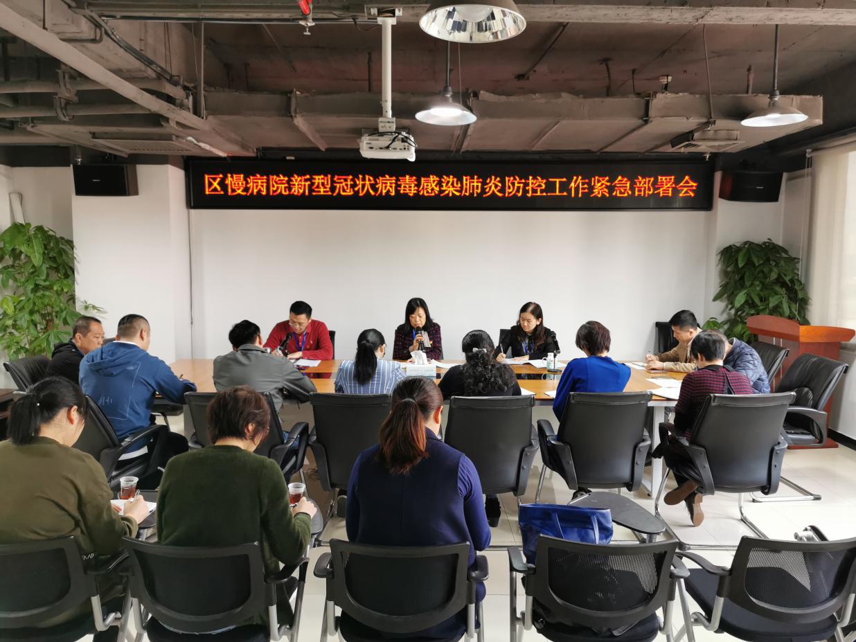 2020年1月23日上午,赵蓉书记在众鑫科技大厦1605大会议室主持召开区慢性病防治院新型冠状病毒感染肺炎防控工作紧急部署会,传达了区委区政府有关新型冠状病毒肺炎防控工作紧急会议精神和区卫健康局工作指示,对我院防控工作进行了再动员、再部署、再落实。