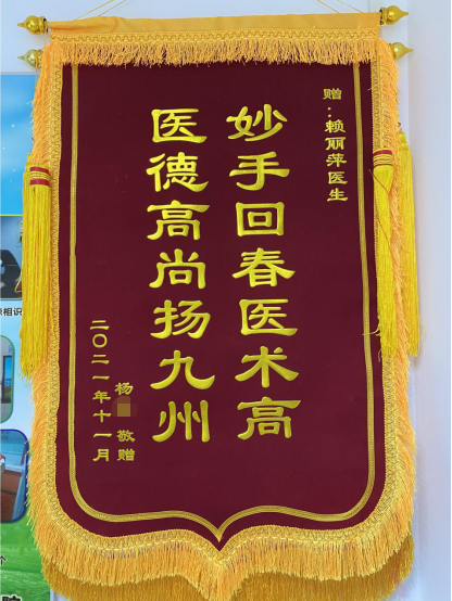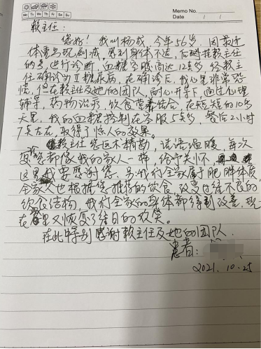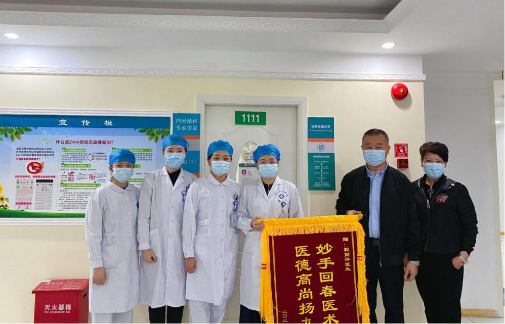 2021年11月15日,综合门诊部主任赖丽萍收到患者杨先生送来的一面锦旗。原来一个多月前,患者杨先生因身体不适、体重骤减等经社康转诊找到了赖主任,检查结果是糖尿病和中度脂肪肝。赖主任给与药物治疗并进行了详细的饮食运动指导。杨先生严格遵照医嘱服药,开展自我健康管理,10天后症状便大为缓解,血糖指数正常,尿酮阴性。而杨先生全家人按照赖主任指导的健康方式生活,体重超标和血压偏高的现象都得到了改善。杨先生送来锦旗并写下感谢信,称赞赖主任的健康宣教和吃药一样管用。赖主任可谓“医者父母心”。赖主任表示,除了用药,糖尿病人的饮食调节和体重控制也十分重要。人人都是自己健康的第一责任人,只有保持健康生活方式,才能达到事半功倍的效果。(潘爱玲/文、图)