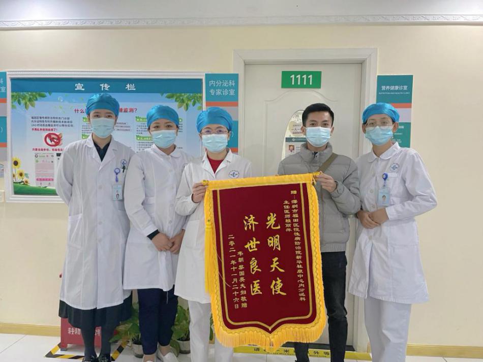 2021年12月1日,一位患者家属来到福田区慢性病防治院综合门诊内分泌科,为赖丽萍主任医疗团队送上一面写着“光明天使,济世良医”的锦旗,他激动地说:“我非常感谢赖主任对我老婆的诊治,现在母子平安,全家都很开心!”