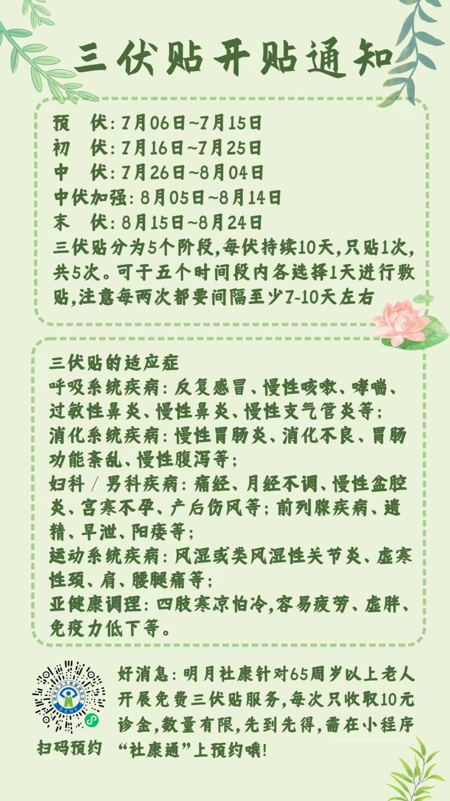 今年明月社康中心再次推出65岁以上老年人免费三伏贴活动,每次仅收取10元诊金。为确保“三伏贴”工作的顺利进行,明月社康中心在加强疫情防控工作的基础上,在家庭医生群里提前发布信息,引导居民提前预约,分流错峰就诊,避免人员聚集。活动现场针对每位居民的具体情况,详细问诊,认真查体,辨证施治。在医务人员的引导下,首日已有数十名居民有序进行穴位贴敷治疗。(梁先敏/文、图)