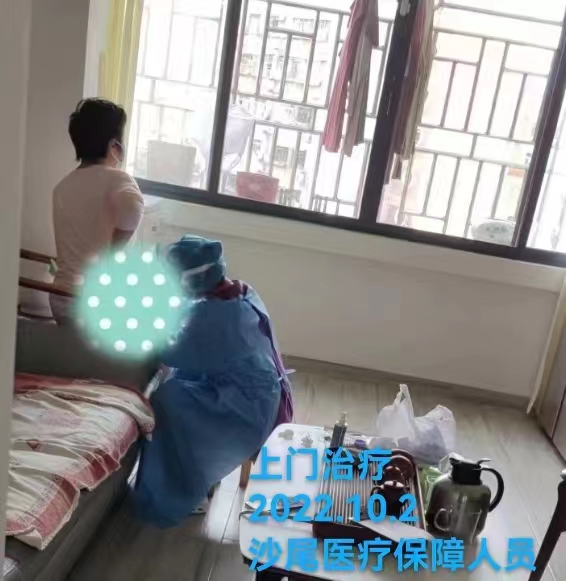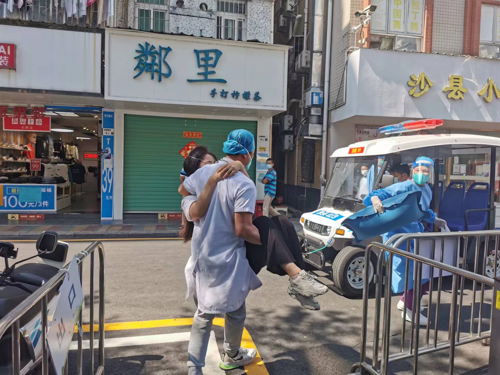 10月15日上午,在沙尾文化广场核酸采样点,一位居民突然晕倒,头晕、发冷,处于半昏迷状态。沙尾社康中心医疗保障点接到电话后,医护人员迅速带好急救物品赶到,争分夺秒给居民监测血糖、测量血压、吸氧,经过一番抢救,居民转危为安。由于需要继续到社康中心输液治疗,而居民无力行走,蔡庆培医生二话不说,撸起袖子抱起这位居民上了巡逻车。疫病无情,人间有爱。在疫情期间,沙尾社康中心医护人员上门给脑出血五年瘫痪在床的老人置入鼻饲管,为孕妇注射黄体酮,给糖尿病患者注射胰岛素,对病例进行转诊,转运密接或者阳性病例等等。嗓子哑了,眼睛熬红了,脱下防护服浑身都湿透了,他们都毫无怨言,用行动诠释了“医者仁心”。(杨侣婧/文、图)