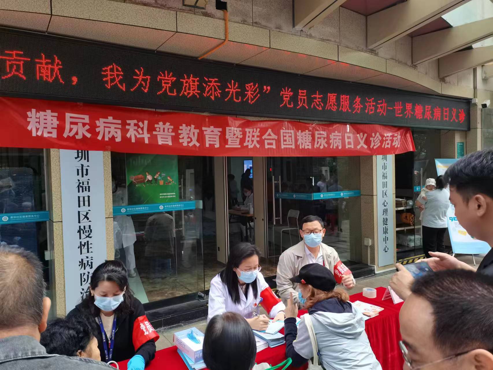 福田区慢性病防治院党委联合南园街道南园社区党委、沙头街道新华社区党委在飞扬时代广场、新华社区开展两场大型世界糖尿病日科普义诊宣传活动,各党支部党员积极参加。活动现场设有专家义诊咨询区、健康体测区、知识问答区,医务人员免费为市民测量血压和血糖,讲解糖尿病的一般常识、引起糖尿病的原因、糖尿病的危害及糖尿病防治等相关知识,发放糖尿病知识防治知识手册以及全民健康生活方式行动等相关宣传资料,接受健康咨询约五百人次。工作人员耐心解答患者提出的健康疑难问题,对现场测量血压及血糖偏高的患者给予饮食、运动、日常监测和安全用药指导,积极向群众普及健康生活方式等相关知识,使市民进一步了解糖尿病的防范措施,养成定期测量血压及血糖的习惯,做到早发现、早诊断、早治疗,强化糖尿病病防治意识和认知水平,得到了良好的宣传效果,受到了市民的广泛好评。